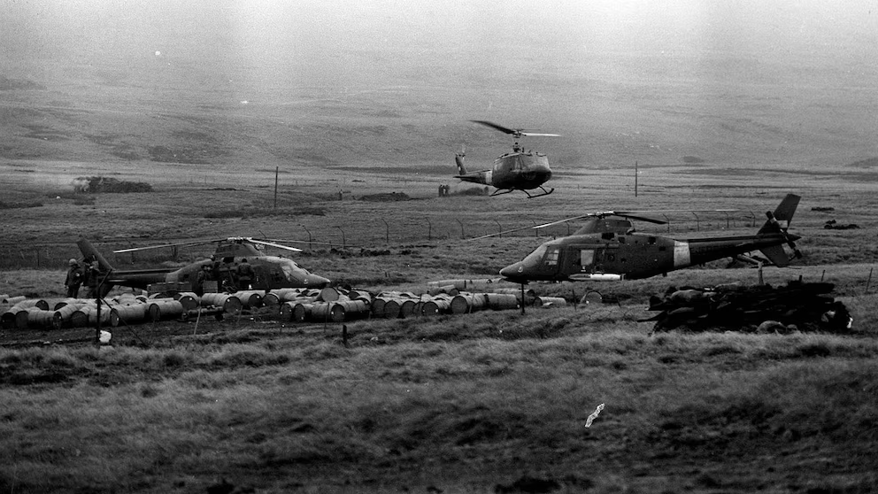 Helicópteros argentinos patrullan áreas rurales (fines de mayo de 1982) de las Islas Malvinas (Eduardo Farré/Télam)