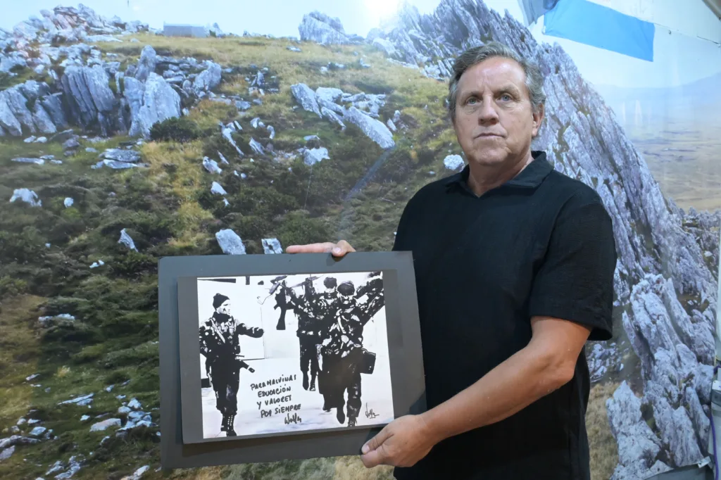 “Los Veteranos de Guerra somos ciudadanos que elegimos defender a nuestra nación. Vine acá para hacer eso, pero desde la cultura”, dice el coronel Esteban Vilgré Lamadrid, junto a una de las fotos más icónicas que dejó la defensa de la soberanía (Foto: Fernando Calzada)