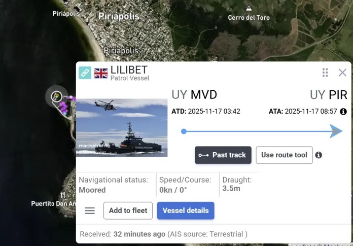De acuerdo con la información publicada por el portales uruguayos, el FPV Lilibet llegó a Piriápolis el 17 de noviembre, fuera de su área normal de operaciones, con el objetivo de inspeccionar el casco, realizar controles de rutina y esperar repuestos esenciales. La escala, presentada como una maniobra puramente técnica, se inserta sin embargo en un patrón más amplio de uso de puertos uruguayos como apoyo a la operatoria británica en el Atlántico Sur y en el entorno de Malvinas.