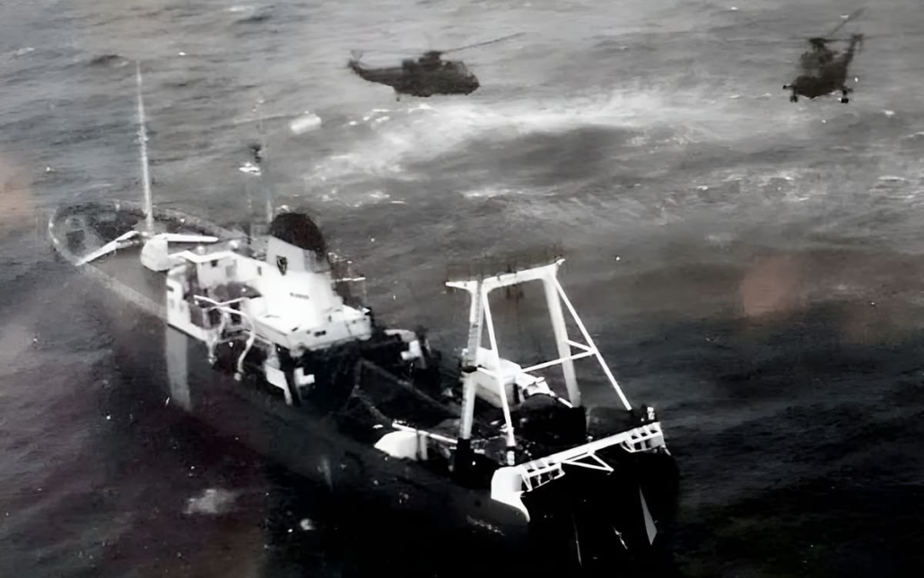Imagen real tomada desde un tercer helicóptero el 9 de mayo de 1982 sobre el BP Narwal.