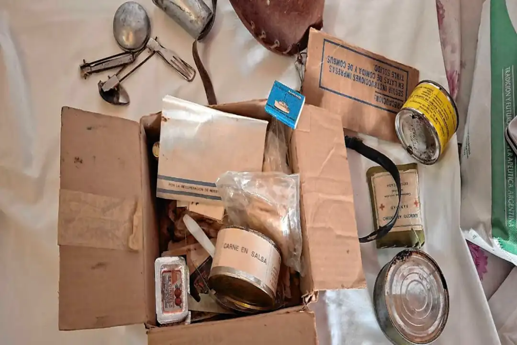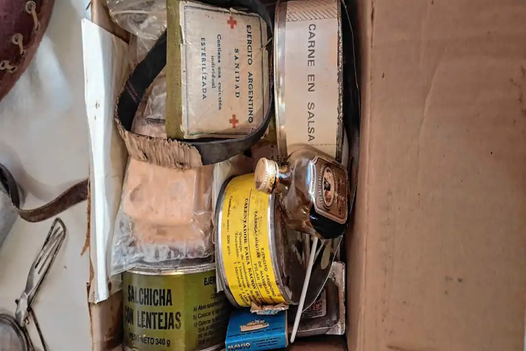 En una caja pequeña, el tiempo parece haberse detenido. Hay galletas envasadas al vacío, un calentador en gel, fósforos y un sobre que aún conserva una consigna intacta: “Por la recuperación de nuestras Islas Malvinas”. Son fragmentos de vida de personas que nunca volvieron y hoy habitan en la casa de Gregorio Garzoglio.