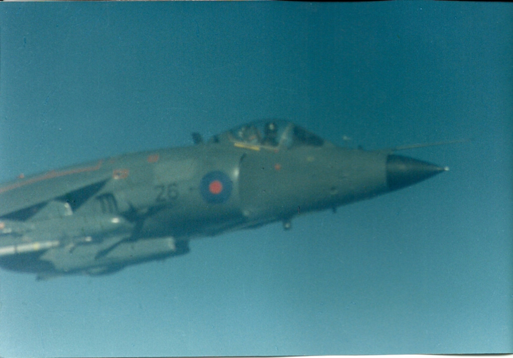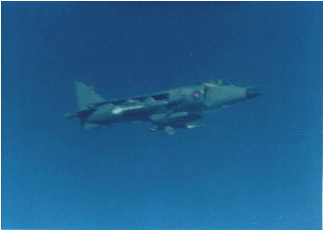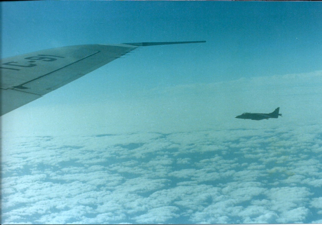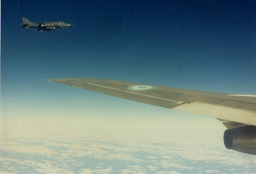 Faltando un cuarto de hora para las 13, el Boeing 707 comenzó su ascenso. Minutos más tarde vieron aparecer dos Sea Harrier de la Royal Navy, armados con misiles AIM-9L Sidewinder. Uno se ubicó a un flanco del avión argentino, y el otro se mantuvo en posición por debajo, en búsqueda de antenas de equipos de guerra electrónica, o de detección, que les hubiera permitido encontrar a la flota en medio del mar.