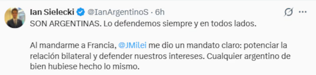 Más tarde, Sielecki volvió sobre el episodio en su cuenta de X. “SON ARGENTINAS. Lo defendemos siempre y en todos lados”, escribió, y sostuvo que su tarea en Francia incluye defender los intereses del país.